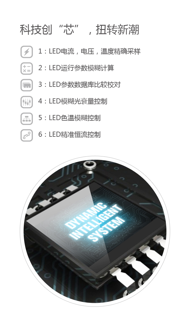 LED 第四代数字智能“动态管理模糊光衰控制”电路驱动器(动态电流、电压、光衰、调光、通讯、温度、输出功率控制)技术。